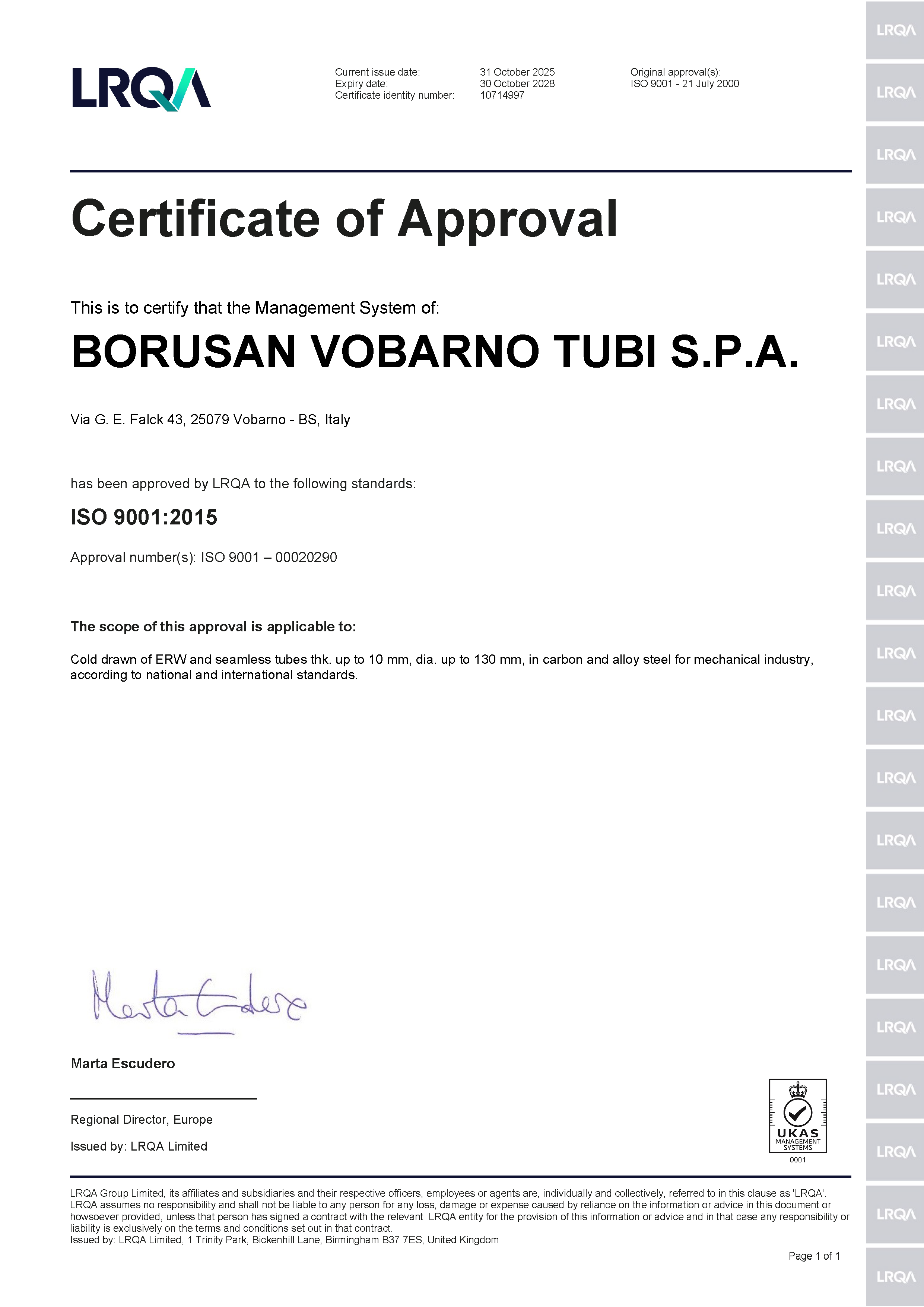 The Borusan Vobarno Tubi quality management system guarantees that the customer needs and the necessity to the international standards conformity will be transferred to all the organization levels.